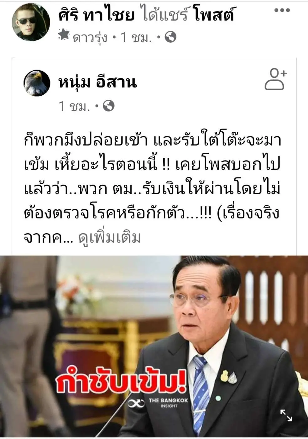 "ก็พวกมึงปล่อยเข้า และรับใต้โต๊ะจะมาเข้ม เ...้ยอะไรตอนนี้ !! เคยโพสบอกไปแล้วว่า..พวก ตม..รับเงินให้ผ่านโดยไม่ต้องตรวจโรคหรือกักตัว...!!! (เรื่องจริงจากคนที่จ่ายเงินเข้าประเทศ)"