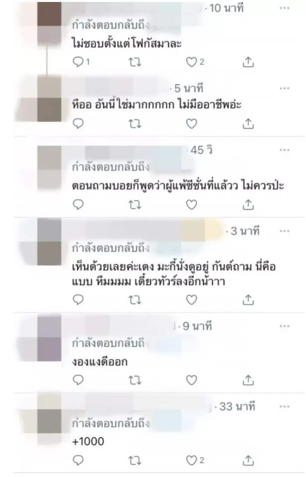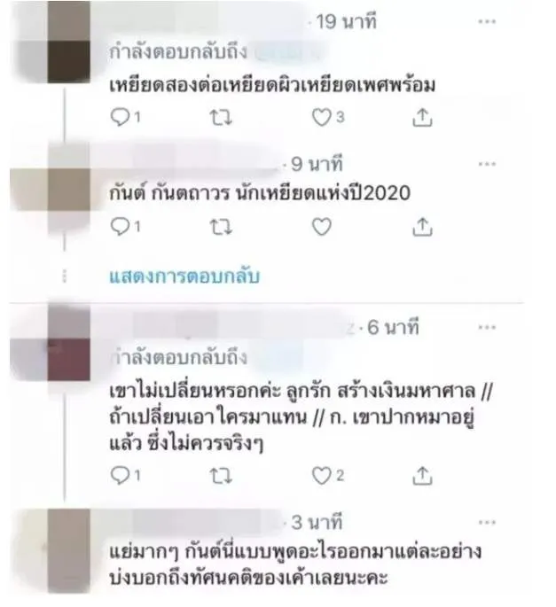 เช่นก็บอกว่า "กันต์ไม่มีมารยาทอีกละ ถามรัศมีแขว่าเป็นคิงคองตัวผู้หรือตัวเมีย สมัยนี้แล้วมาสงสัยเพสอะไรค้า ถึงจะพูดเอาฮาแต่ไม่ฮานะค้าคุณพี่ พี่แขดูสะอึกไปแป๊บนึ่งด้วย ควรเปลี่ยนพิธีกรป๊ะ ถามจริง"
