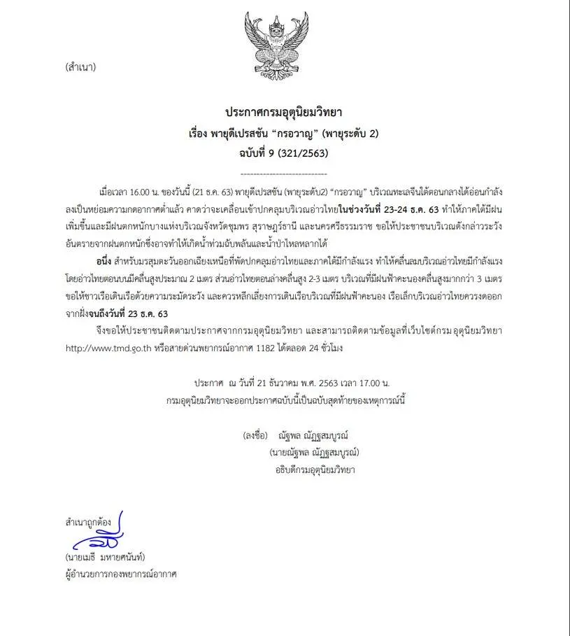 22 ธันวาคม 2563 เวลา 08.40 น. วันนี้ กรมอุตุฯ ประกาศเตือนพื้นที่สีแดง รับมือพายุกรอวาญ ระดับ 2 ฉบับที่ 9 ลงวันที่ 21 ธันวาคม 2563 โดยระบุ เมื่อเวลา 16.00 น. ของวันที่ 21 ธันวาคม 2563 พายุระดับ 2 กรอวาญ บริเวณทะเลจีนใต้ตอนกลางได้อ่อนกำลังลงเป็นหย่อมกดอากาศต่ำแล้ว คาดว่าจะเคลื่อนเข้าปกคลองบริเวณอ่าวไทยในช่วงวันที่ 23-24 ธันวาคม 2563