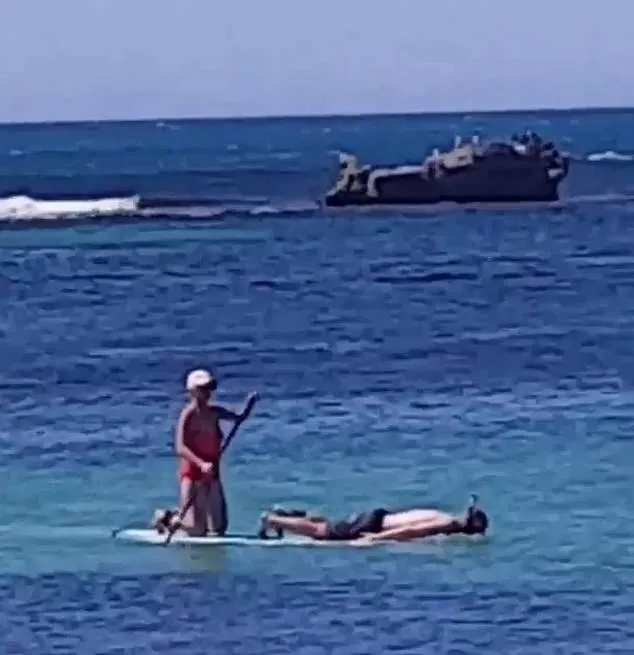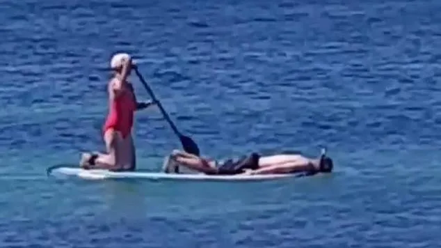 ชายคนนี้นอนคว่ำอยู่บนกระดาน ในขณะที่เพื่อนของเขา ได้รับมอบหมายให้พายกระดาน ไปรอบๆ เพื่อที่เขาจะได้สังเกตุโลกใต้น้ำได้อย่างสบายๆ