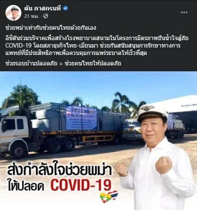 เนื้อหาระบุข้อความว่า "ช่วยพม่าเท่ากับช่วยคนไทยด้วยกันเอง อิชิตันร่วมบริจาคเพื่อสร้างโรงพยาบาลสนามในโครงการมิตรภาพปันน้ำใจสู้ภัย COVID-19 โดยสภาธุรกิจไทย-เมียนมา ช่วยกันสนับสนุนการรักษาทางการแพทย์ที่มีประสิทธิภาพเพื่อควบคุมการแพร่ระบาดให้เร็วที่สุด ช่วยรอบบ้านปลอดภัย = ช่วยคนไทยให้ปลอดภัย"