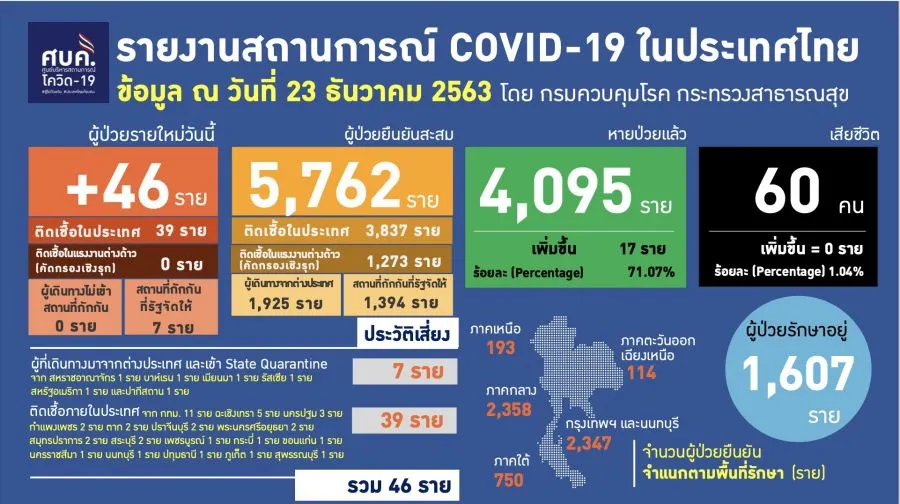 ยอดโควิด 23 ธ.ค.63 ติดเชื้อรายใหม่ 46 ราย จากในประเทศ 39 ราย ต่างประเทศ 7 ราย แรงงานต่างด้าว 0 ราย