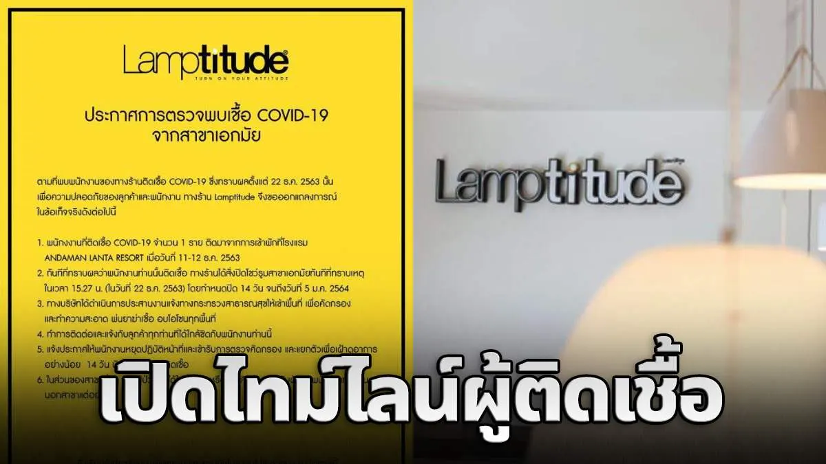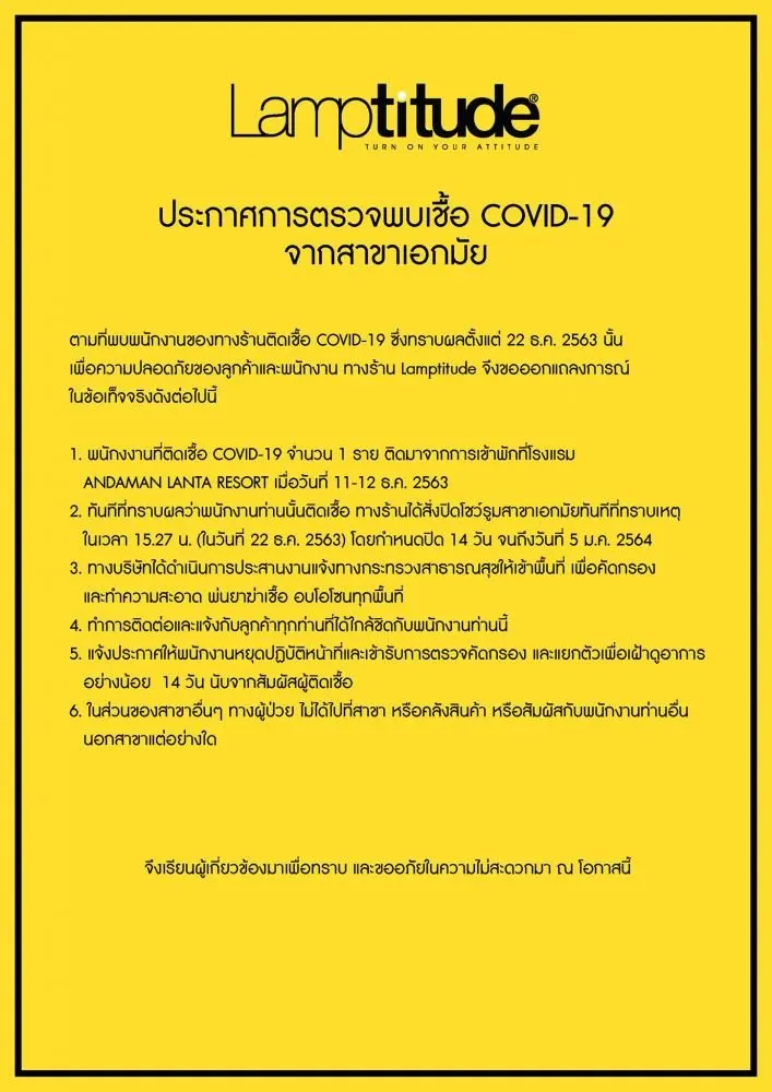 23 ธันวาคม : แฟนเพจร้ายขายโคมไฟ Lamptitude โพสต์ประกาศตรวจพบผู้ติดเชื้อโควิด-19 ที่สาขาเอกมัย ระบุว่า “Lamptitude สาขาเอกมัย ขอเรียนแจ้งให้ทราบว่า เมื่อวันที่ 22 ธันวาคม 63 เวลา 15.27 น ได้รับแจ้งจากพนักงาน 1 ท่าน ติดเชื้อไวรัสโคโรนา ทันทีที่ทราบเหตุการณ์ ทางร้านได้แจ้งปิดสาขา หยุดรับลูกค้าทันที และรีบติดต่อประสานงาน แจ้งกระทรวงสาธารณสุขให้เข้าพื้นที่ ทำความสะอาดฆ่าเชื้อ และปิดพื้นที่ในวันที่ 23 ธันวาคม 63