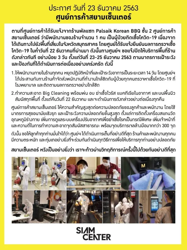 ทางศูนย์การค้าขอแจ้งปิดบริการพื้นที่ร้านดังกล่าวทันที อย่างน้อย 3 วัน ตั้งแต่วันที่ 23-25 ธ.ค. พร้อมให้พนักงานภายในร้านทุกคนหยุดปฏิบัติหน้าที่ และเฝ้าระวังอาการเป็นระยะเวลา 14 วัน พร้อมประสานทางร้านอาหาร จัดส่งพนักงานไปตรวจหาเชื้อโควิด19 ที่โรงพยาบาล และติดตามผล