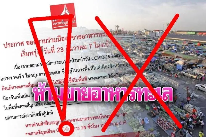 เจอข่าวนี้แล้วตกใจเลย บอกว่า "ตลาดสี่มุมเมือง ประกาศห้ามขายอาหารทะเล และกุ้งทุกชนิด เนื่องจากสถานการณ์การระบาดโคโรนาไวรัส COVID-19 ในกลุ่มอาหารทะเล แต่ยังสามารถขายปลา หอย และปูน้ำจืดได้ จนกว่าสถานการณ์จะกลับเข้าสู่ปกติ” !?!