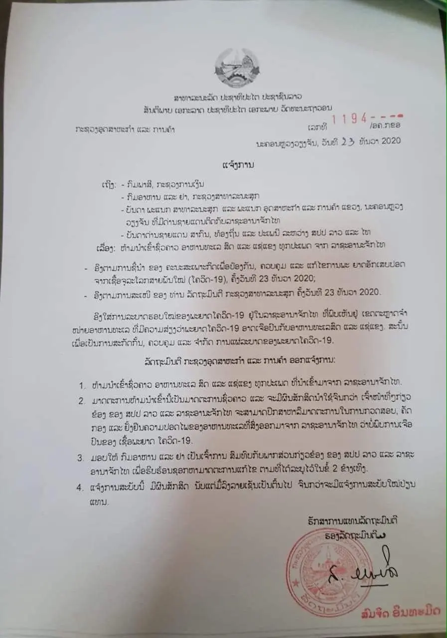 23 ธันวาคม 2563 ฯพณฯ สมจิด อินทะมิด รักษาการแทนรัฐมนตรีว่าการกระทรวงอุตสาหกรรมและการค้า สปป.ลาว ออกคำสั่งวันที่ 23 ธันวาคม 63 ห้ามนำเข้าชั่วคราว อาหารทะเลสดและแช่แข็งทุกประเภท ที่มาจากราชอาณาจักรไทย โดยเอกสารคำสั่งระบุว่า เนื่องจากการระบาดรอบใหม่ของโรคไวรัสโควิด-19 ที่มีอยู่ในเขตจำหน่ายอาหารทะเลของไทย มีความเสี่ยงว่าเชื้อโรคอาจเจือปนอยู่ในอาหารทะเลสดและแช่แข็ง จึงได้ออกคำสั่งดังกล่าว เพื่อเป็นการป้องกัน ควบคุม และแก้ไขการแพร่ระบาดของโรคไวรัสโคโรนาตั้งแต่วันนี้จนกว่าจะมีการเปลี่ยนแปลง