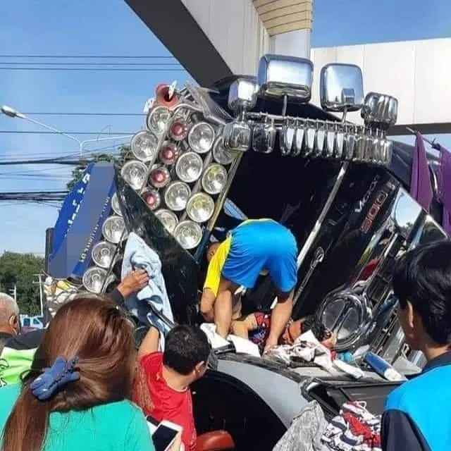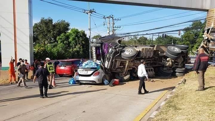 คนขับเป็น เจ้าของโชว์รูมรถยนต์ที่โคราชขับรถเบนซ์มากับภรรยา ขณะเกิดเหตุจอดติดไฟแดง จู่ๆมีรถพ่วงบรรทุกหินคลุกพุ่งชนป้าย ก่อนพลิกคว่ำลงมาทับทั้งคัน โชคยังดีได้รับบาดเจ็บไม่สาหัส ส่วนคนขับรถบรรทุกอาการสาหัส