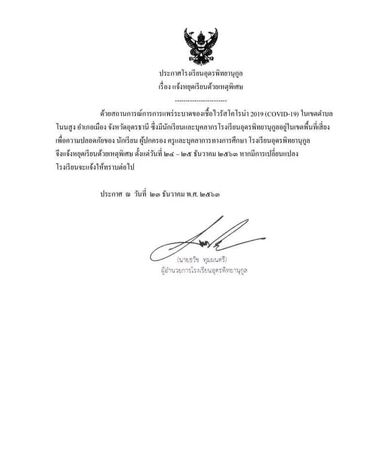 โรงเรียนอุดรพิทยานุกูล ,โรงเรียนอุดรพิชัยรักษ์ และโรงเรียนประจักษ์ศิลปาคาร ประกาศปิด ตั้งแต่วันที่ 24-25 ธ.ค.63 ส่วน โรงเรียนเซนต์เมรี่ อุดรธานี ปิดตั้งแต่วันที่ 24 ธ.ค. 63 - 4 ม.ค. 64 จนกว่าจะมีการเปลี่ยนแปลง...