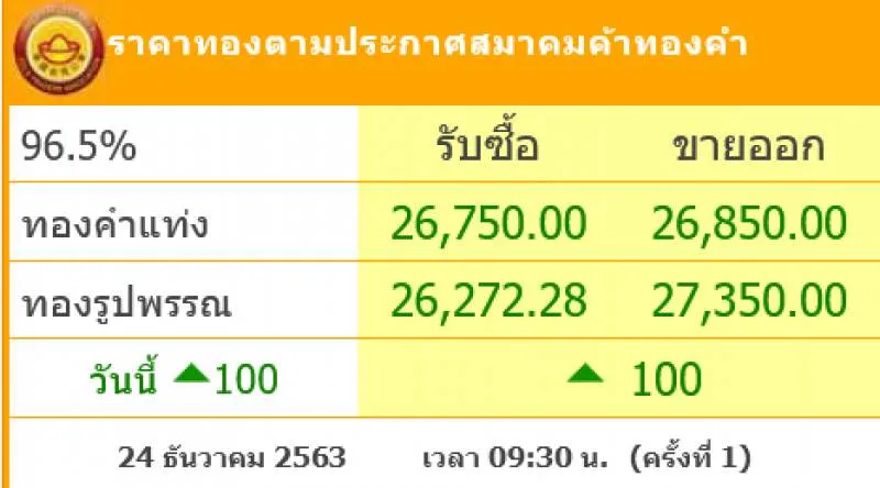 วันที่ 24 ธันวาคม 2563 ผู้สื่อข่าว siamtoday ได้รับรายงานว่า เว็บไซต์ราคาทอองจากสมาคมทองคำ ได้ประกาศราคาทอง ครั้งที่ 1 เวลา 9.30 น. เปิดตัวเพิ่มขึ้น 100 บาท โดย ทองคำแท่ง รับซื้ออยู่ที่ 26,750บาท ขายออก 26,850 บาท ทองรูปพรรณ รับซื้ออยู่ที่ 26,272.28 บาท ขายออก 27,350 บาท