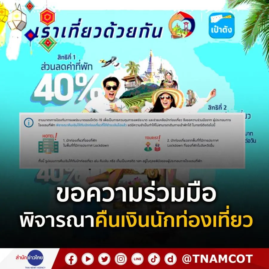 เว็บไซต์ #เราเที่ยวด้วยกัน แจ้งขอความร่วมมือจากผู้ประกอบการโรงแรมที่พัก พิจารณาคืนเงินให้กับนักท่องเที่ยวที่ได้ชำระเงินไปแล้ว แต่มีความจำเป็นทำให้ไม่สามารถเดินทางเข้าพักได้ ในกรณีดังต่อไปนี้