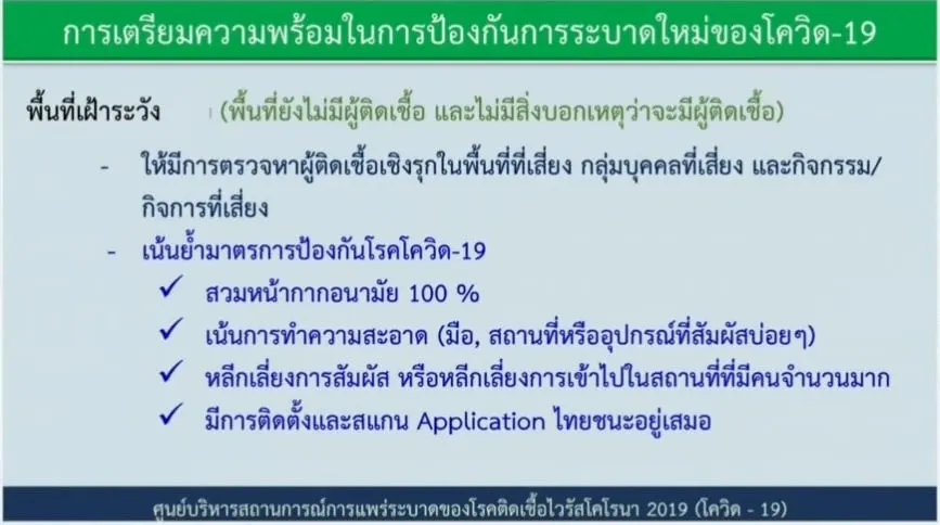 4.พื้นที่สีเขียว ถือเป็นพื้นที่ยังไม่มีผู้ติดเชื้อ และไม่มีสิ่งบอกเหตุว่ามีจะมีเชื้อ ได้แก่จังหวัดอื่น ๆ ที่ยังไม่มีผู้ติดเชื้อ และไม่มีสิ่งบอกเหตุว่าจะมีผู้ติดเชื้อ