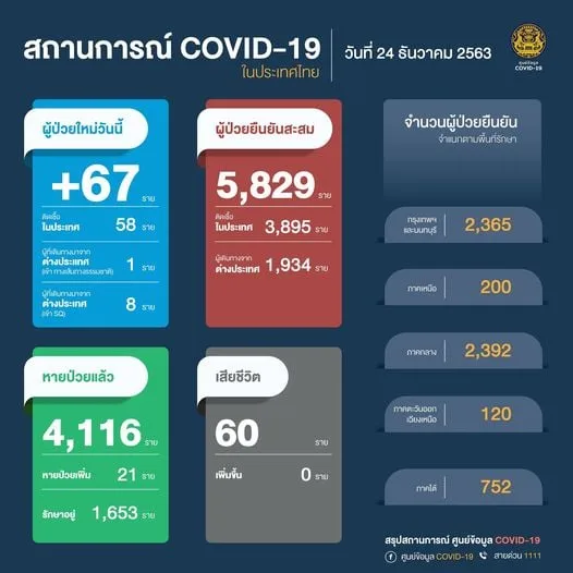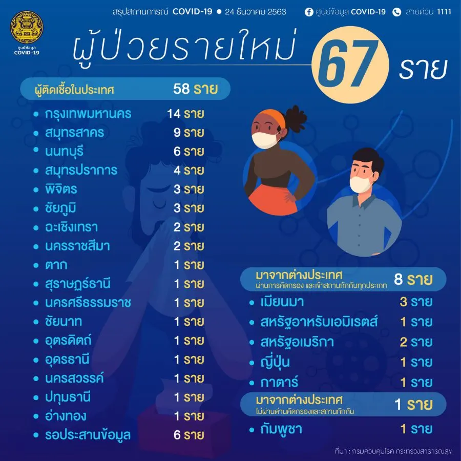 รายละเอียดผู้ป่วยรายใหม่ 67 ราย เป็นคนไทย 5 ราย สัญชาติอเมริกัน 3 ราย