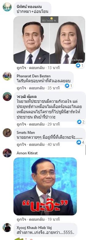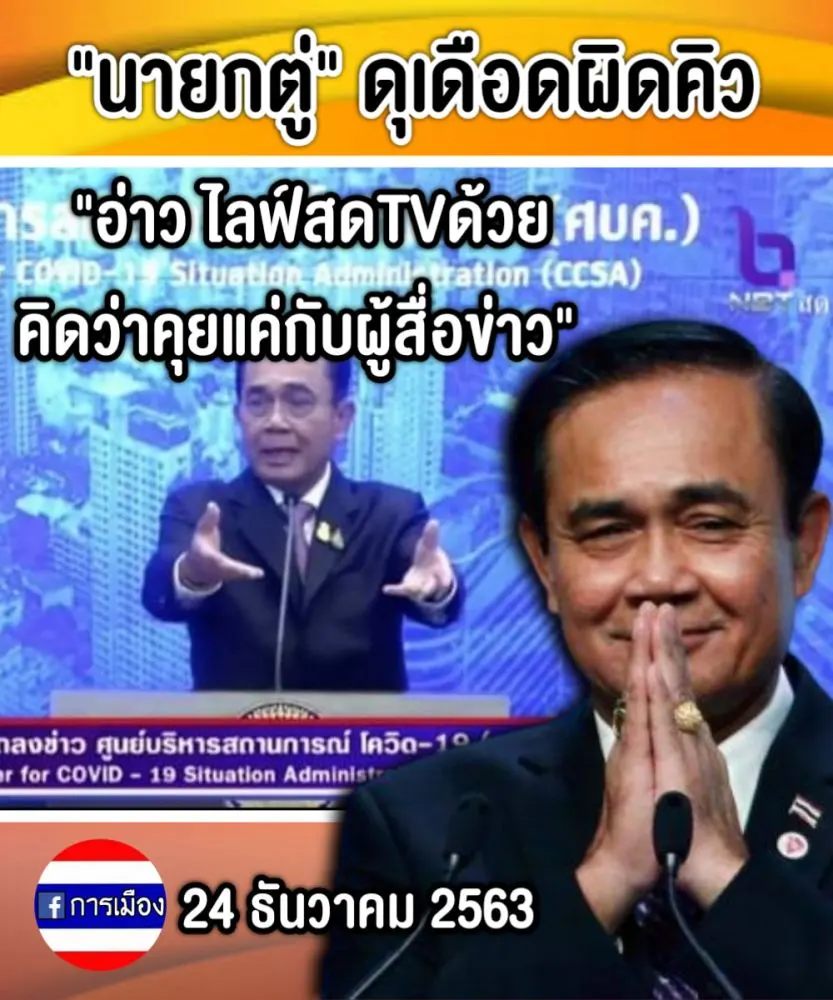 บนเพจการเมืองได้มีการแชร์ข้อความและภาพประกอบเกี่ยวกับนายกประยุทธ์ จันทร์โอชา ดุเดือด ผิดคิว คิดว่าตัวเองคุยกับแค่ผ้สื่อข่าว ที่ไหนได้มีไลน์สดด้วย โดยข้อความใจความประมาณว่า "คนไทย70กว่าล้านคน จะทำให้ถูกใจ ทุกคนมันคงไม่ได้อะเนาะ โอเคนะจ๊ะ ช่วยกัน นะจ๊ะ พอใจแล้วนะจ๊ะ"