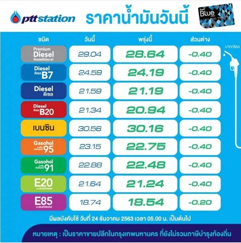 ประกาศปรับลดราคาน้ำมันกลุ่มแก๊ สโซฮอล์ และ กลุ่มดีเซล 40 สตางค์/ลิตร ยกเว้น E85 ปรับลด 20 สตางค์/ลิตร มีผลตั้งแต่เวลา 05.00 น. วันที่ 24 ธันวาคม 2563 สำหรับใครน้ำมันใกล้หมดถังพรุ่งนี้ค่อยเติม เพราะน้ำมันปรับลดราคาทุกชนิดถึง 40 สตางค์