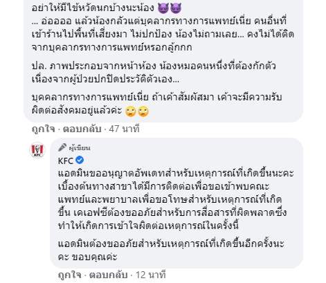 โดยทางแอดมิน KFC ได้กล่าวว่า "แอดมินขออนุญาตอัพเดทสำหรับเหตุการณ์ที่เกิดขึ้นนะคะ เบื้องต้นทางสาขาได้มีการติดต่อเพื่อขอเข้าพบคณะแพทย์และพยาบาลเพื่อขอโทษสำหรับเหตุการณ์ที่เกิดขึ้น เคเอฟซีต้องขออภัยสำหรับการสื่อสารที่ผิดพลาดซึ่งทำให้เกิดการเข้าใจผิดต่อเหตุการณ์ในครั้งนี้ แอดมินต้องขออภัยสำหรับเหตุการณ์ที่เกิดขึ้นอีกครั้งนะคะ ขอบคุณค่ะ"