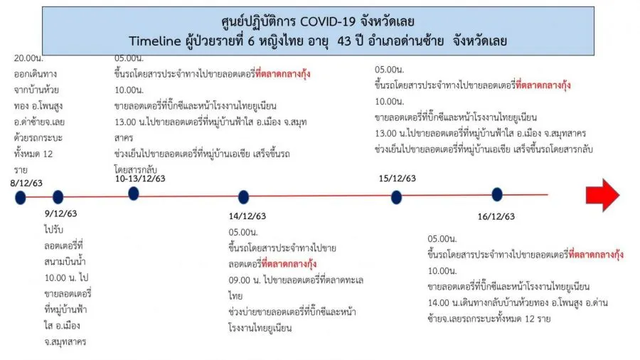 วันที่ 16 ธ.ค.63 เวลา 05.30 น. นั่งรถโดยสารไปขายลอตเตอรี่ที่ตลาดกุ้ง เวลา 10.00 น. ขายลอตเตอรี่ที่บิ๊กซีและหน้าโรงงานไทยยูเนี่ยน เวลา 14.00 น. เดินทางกลับบ้านห้วยทอง ต.โพนสูง อ.ด่านซ้าย จ.เลย นั่งรถกระบะกับเพื่อนที่ขายลอตเตอรี่ด้วยกัน 12 ราย