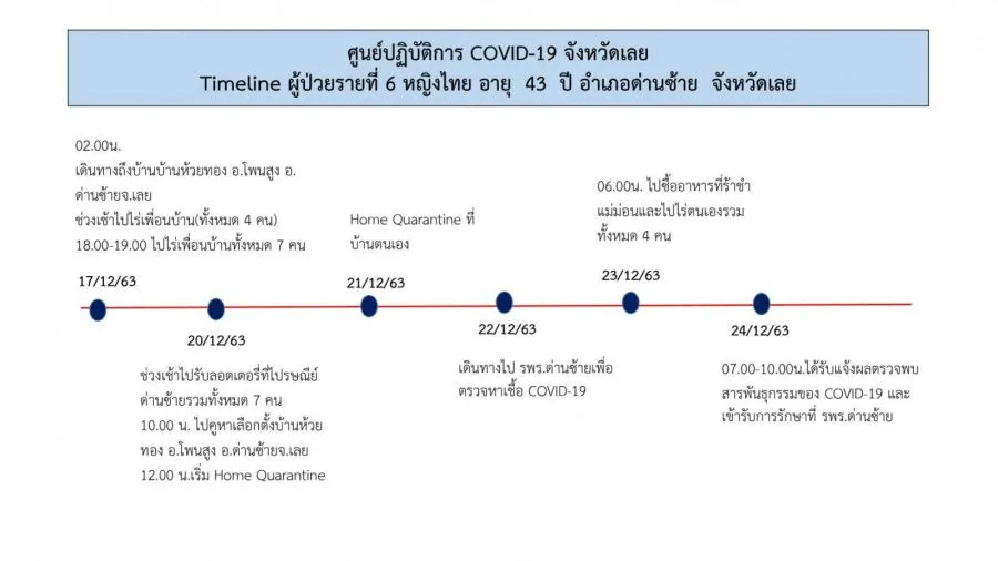 พบผู้ติดเชื้อโควิดรายแรกของ จ.เลย ในรอบนี้ เป็นเพศหญิง อาศัยอยู่ที่บ้านห้วยทอง ต.โพนสูง อ.ด่านซ้าย จ.เลย โดยไม่แสดงอาการ ขณะนี้รักษาตัวอยู่ที่ รพ.สมเด็จพระยุพราชด่านซ้าย และยังมีผู้ข้างเคียงสัมผัสอีก 32 ราย อยู่ระหว่างตรวจเชื้อโควิด จะทราบผลในวันพรุ่งนี้ ส่วนไทม์ไลน์ของผู้ติดเชื้อที่ บ้านห้วยทอง ต.โพนสูง อ.ด่านซ้าย จ.เลย มีดังนี้