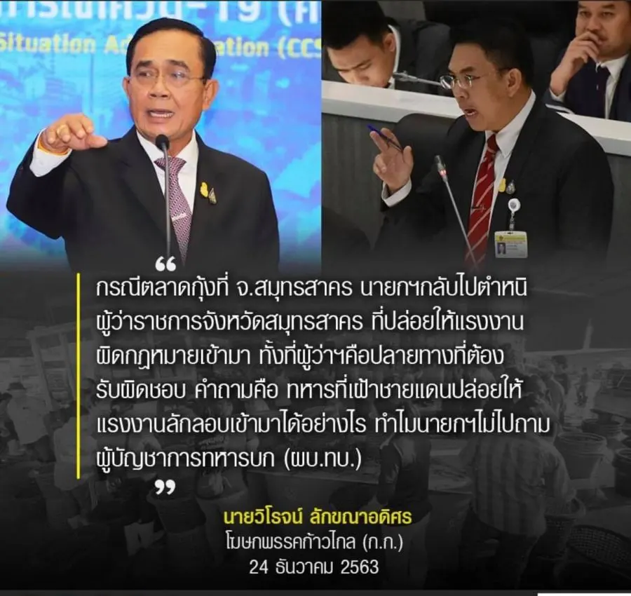 "กรณีตลาดกุ้งที่ จ.สมุทรสาคร นายกฯ กลับไปตำหนิผู้ว่าราชการจังหวัดสมุทรสาคร ที่ปล่อยให้แรงงานผิดกฎหมายเข้ามา ทั้งที่ผู้ว่าฯ คือปลายทางที่ต้องรับผิดชอบ คำถามคือ ทหารที่เฝ้าชายแดนปล่อยให้แรงงานลักลอบเข้ามาได้อย่างไร ทำไมนายกฯไม่ไปถามผู้บัญชาการทหารบก (ผบ.ทบ.) "นายวิโรจน์ ลักขณาอดิศร โฆษกพรรคก้าวไกล (ก.ก.)-24 ธ.ค.63