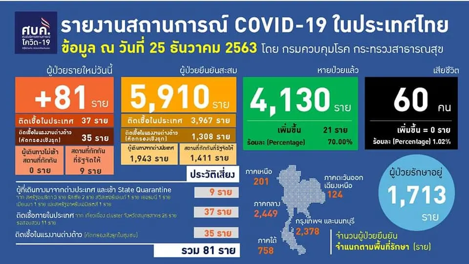 เวลา 11.30 น. วันที่ 25 ธันวาคม 2563 นพ.ทวีศิลป์ วิษณุโยธิน โฆษกศูนย์บริหารสถานการณ์การแพร่ระบาดของโรคติดเชื้อไวรัสโคโรนา 2019 รายงานสถานการณ์ติดเชื้อโควิด-19 พบผู้ติดเชื้อรายใหม่เพิ่ม 81 คน สะสม 5,910 คน ติดเชื้อในประเทศ 37 คน ติดเชื้อในแรงงานต่างด้าว (คัดกรองเชิงรุก) 35 คน ผู้ที่เดินทางมาจากต่างประเทศ และเข้า State Quarantine 9 คน รักษาหายกลับบ้านแล้วเพิ่ม 21 คน ป่วยสะสม 4,130 คน นอนรักษาในรพ. 1,713 คน เสียชีวิต สะสม 60 คน