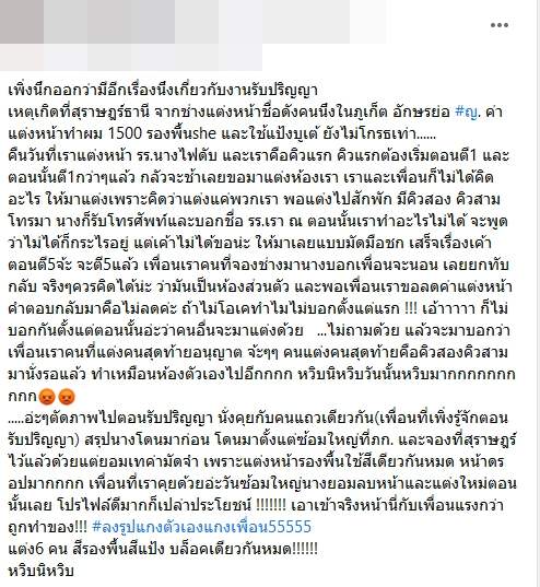 เหตุเกิดที่สุราษฎร์ธานี จากช่างแต่งหน้าชื่อดังคนนึงในภูเก็ต ค่าแต่งหน้าทำผม 1500 รองพื้นshe และใช้แป้งบูเต้ ยังไม่โกรธเท่า......