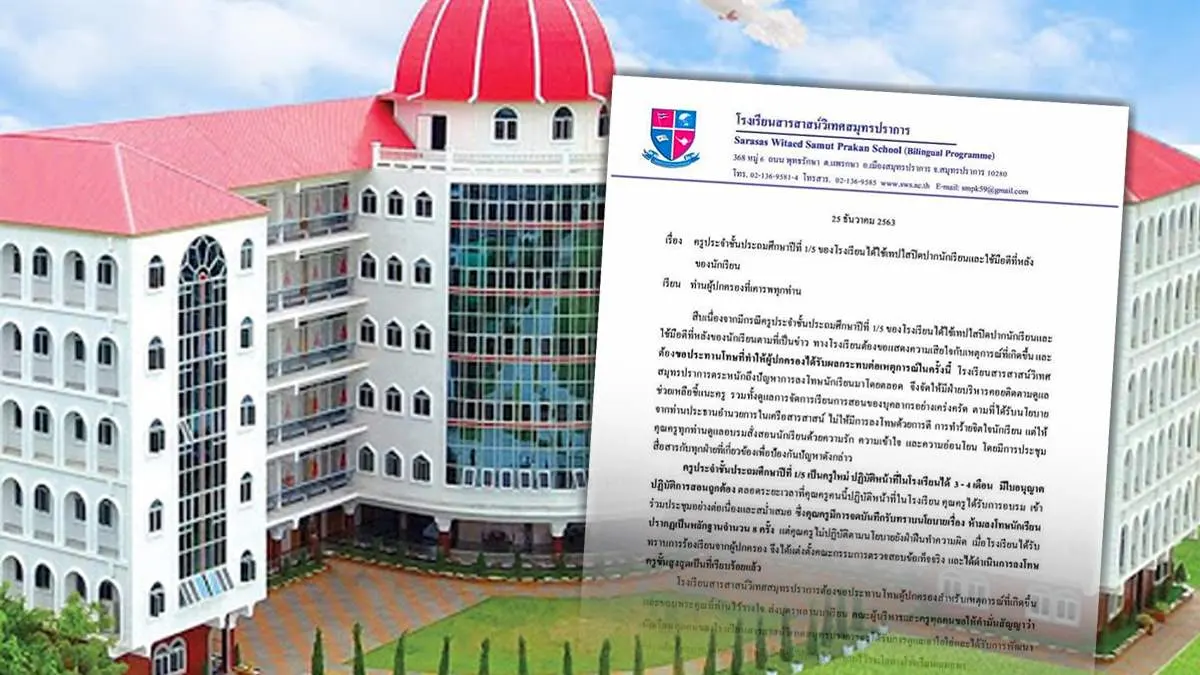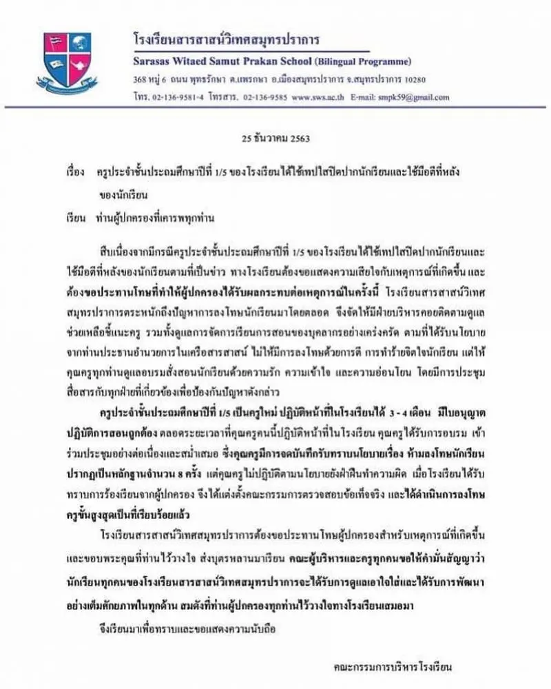 สารสาสน์ฯสมุทรปราการ ขอโทษ เหตุครูใช้เทปปิดปาก-ตีเด็ก ลั่น สั่งเชือดครูขั้นสุดแล้ว