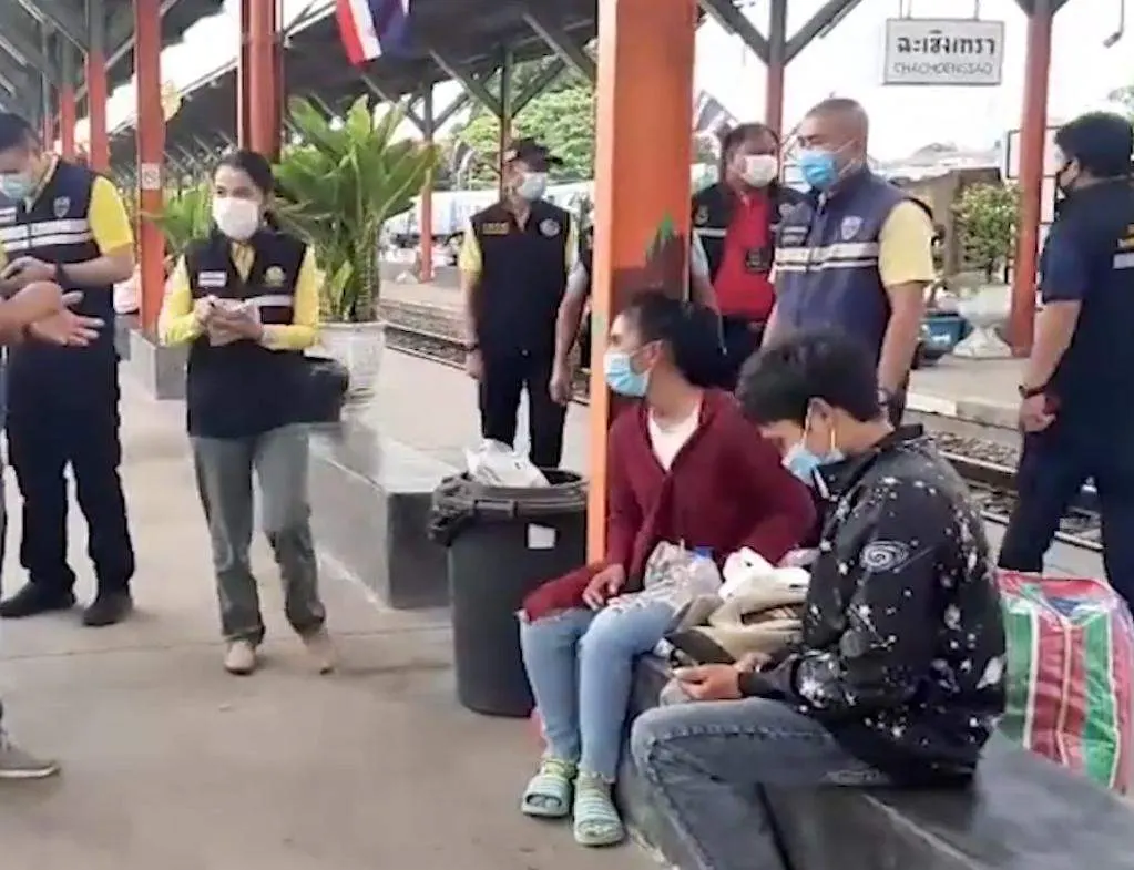 เจ้าหน้าที่ฝ่ายปกครอง พร้อมเจ้าหน้าที่ชุดจัดระเบียบสังคมและชุดเฝ้าระวังโควิด-19 ลงพื้นที่ตรวจสอบสถานีรถไฟฉะเชิงเทรา หลังได้รับทราบว่ามีแรงงานต่างด้าวชาวกัมพูชา 2 ผัวเมีย พยายามจะซื้อตั๋วขึ้นรถไฟไปยังสถานีรถไฟด่านพรมแดนบ้านคลองลึก อำเภออรัญประเทศ จังหวัดสระแก้ว แต่ไม่มีบัตรแรงงานต่างด้าวหรือบัตรแสดงการเข้าเมืองโดยถูกกฎหมาย แถมตรวจวัดไข้ยังพบว่าทั้ง 2 คนมีอุณหภูมิสูง