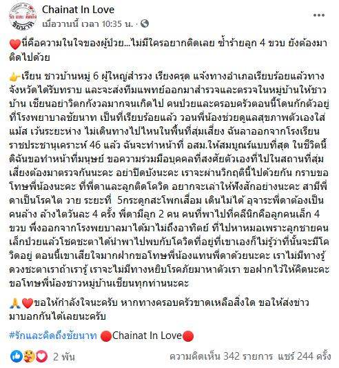 เรียน ชาวบ้านหมู่ 6 ผู้ใหญ่สำรวง เรียงครุด แจ้งทางอำเภอเรียบร้อยแล้วทางจังหวัดได้รับทราบ และจะส่งทีมแพทย์ออกมาสำรวจและตรวจในหมู่บ้านให้ชาวบ้าน เชียนอย่าวิตกกังวลมากจนเกิดไป คนป่วยและครอบครัวตอนนี้โดนกักตัวอยู่ที่โรงพยาบาลชัยนาท เป็นที่เรียบร้อยแล้ว วอนพี่น้องช่วยดูแลสุขภาพตัวเองใส่แม้ส เว้นระยะห่าง ไม่เดินทางไปไหนในพื้นที่สุ่มเสี่ยง ฉันลาออกจากโรงเรียน ราชประชานุเคราะห์ 46 แล้ว ฉันจะทำหน้าที่ อสม.ให้สมบูณร์แบบที่สุด