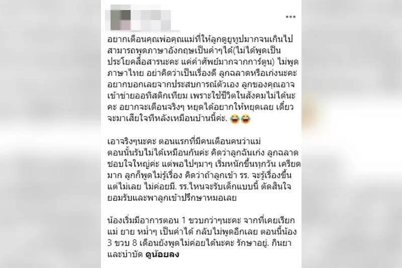 เรียกได้ว่าใครๆก็อยากให้บุตรหลานของตัวเองพูดได้หลายภาษาจะได้เก่งๆ ล่าสุดได้มีคุณแม่รายหนึ่ง ออกมาเตือนอย่าคิดว่าฉลาด ลูกสาว 3 ขวบดูยูทูปพูดศัพท์ ภาษาอังกฤษได้ สุดท้ายพูดไม่รู้เรื่อง ใช้ชีวิตในสังคมไม่ได้ เข้าข่าย ออ-ทิส-ติกเทียม ทำเครียดหนักกว่าเดิม ต้องรักษาทาน ย าบำบัด