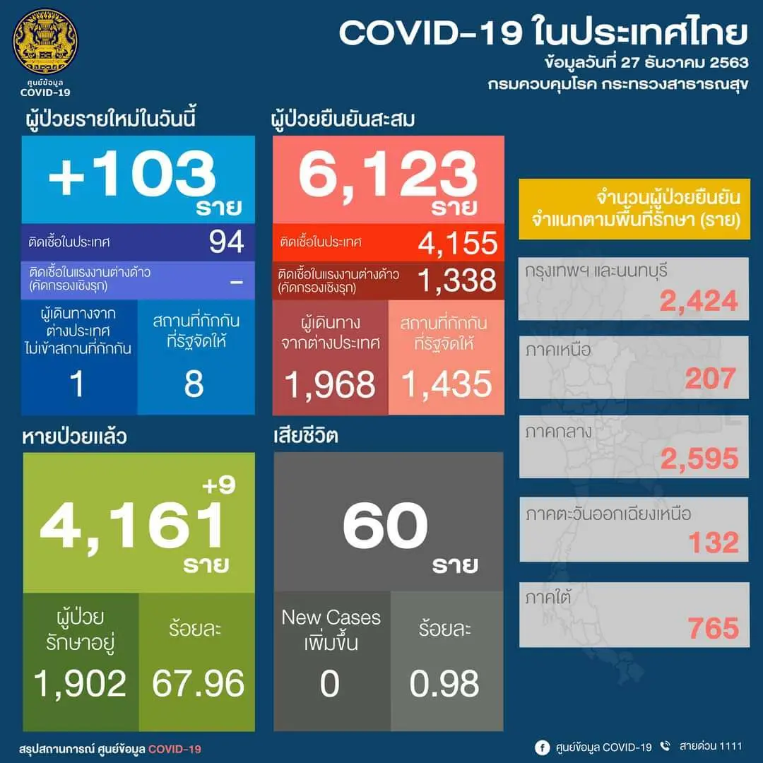 วันที่ 27 ธ.ค.63 ศูนย์ข้อมูล โควิด รายงานตัวเลขผู้ป่วยประจำวันที่ 27 ธ.ค. สถานการณ์การติดเชื้อ พบผู้ป่วยรายใหม่ 103 ราย ผู้ป่วยยืนยันสะสม 6,123 ราย หายป่วยแล้ว 4,161 ราย เสียชีวิตสะสม 60 ราย ในจำนวนนี้ เป็นการติดเชื้อในประเทศ 94 ราย ติดเชื้อในแรงงานต่างด้าว 0 ราย อยู่ในสถานกักกันที่รัฐจัดให้ 8 ราย และผู้เดินทางจากต่างประเทศไม่เข้าสถานที่กักตัว 1 ราย