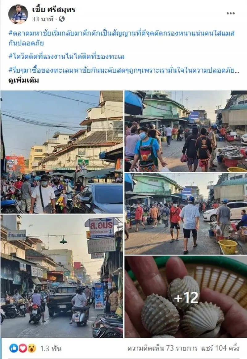 ล่าสุด สถานการณ์ ตลาดมหาชัยก็กลับมาคึกคักอีกครั้ง โดยผู้ใช้เฟซบุ๊ค เซี้ย ศรีสมุทร ได้โพสต์สัญญาณที่ดีของตลาดมหาชัย โดยได้มีผู้คนเริ่มกลับมาจับจ่ายซื้อของกันอย่างเนืองแน่น โดยได้โพสต์ภาพดังกล่าว พร้อมระบุข้อความว่า