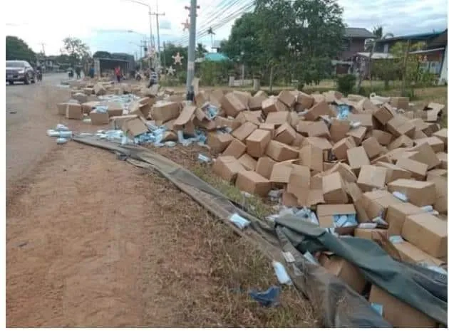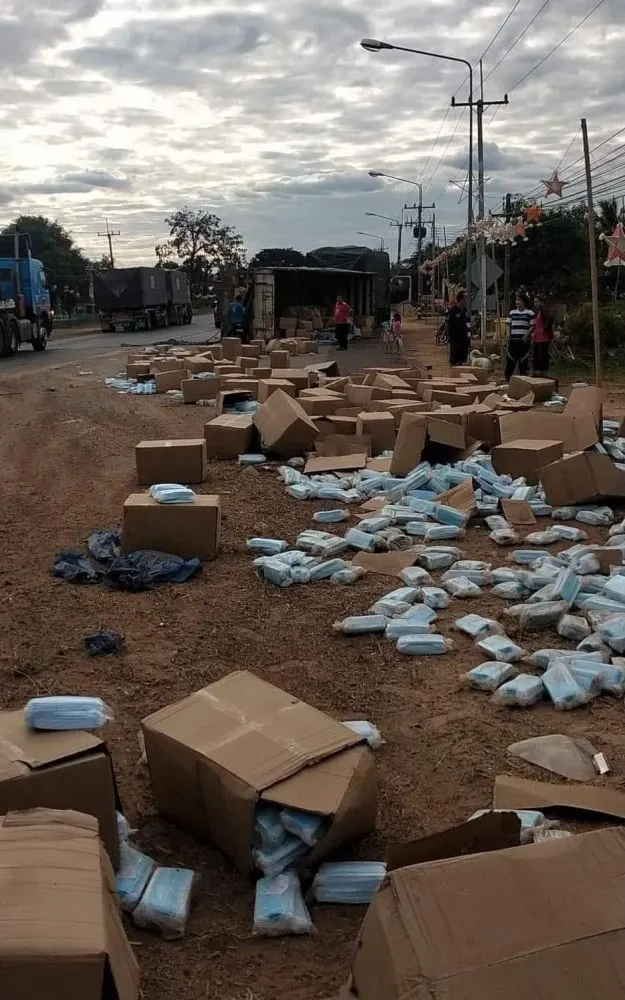 รถพ่วงขน "แมสก์" คว่ำ!! เกลื่อนถนน ไม่รู้ขนไปไหน ไม่มีกล่อง ไม่มีโลโก้