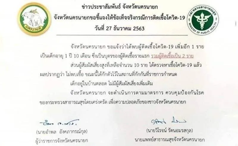 สำหรับสถานการณ์ของ CV-19 ในตอนนี้ พบผู้ติดกระจายอยู่หลายจังหวัด ซึ่งเชื่อมโยงกับจังหวัดสมุทรสาคร ส่วนที่จังหวัดนครนายกนั้นพบผู้ติดแล้ว 1 ราย ล่าสุดเมื่อวันที่ 27 ธ.ค. 2563 จังหวัดนครนายก แจ้งว่า พบผู้ติด CV-19 เพิ่มอีก 1 ราย เป็นเด็กอายุ 1 ปี 10 เดือน ซึ่งเป็นบุตรของผู้ติดรายแรก รวมผู้ติดเป็น 2 ราย