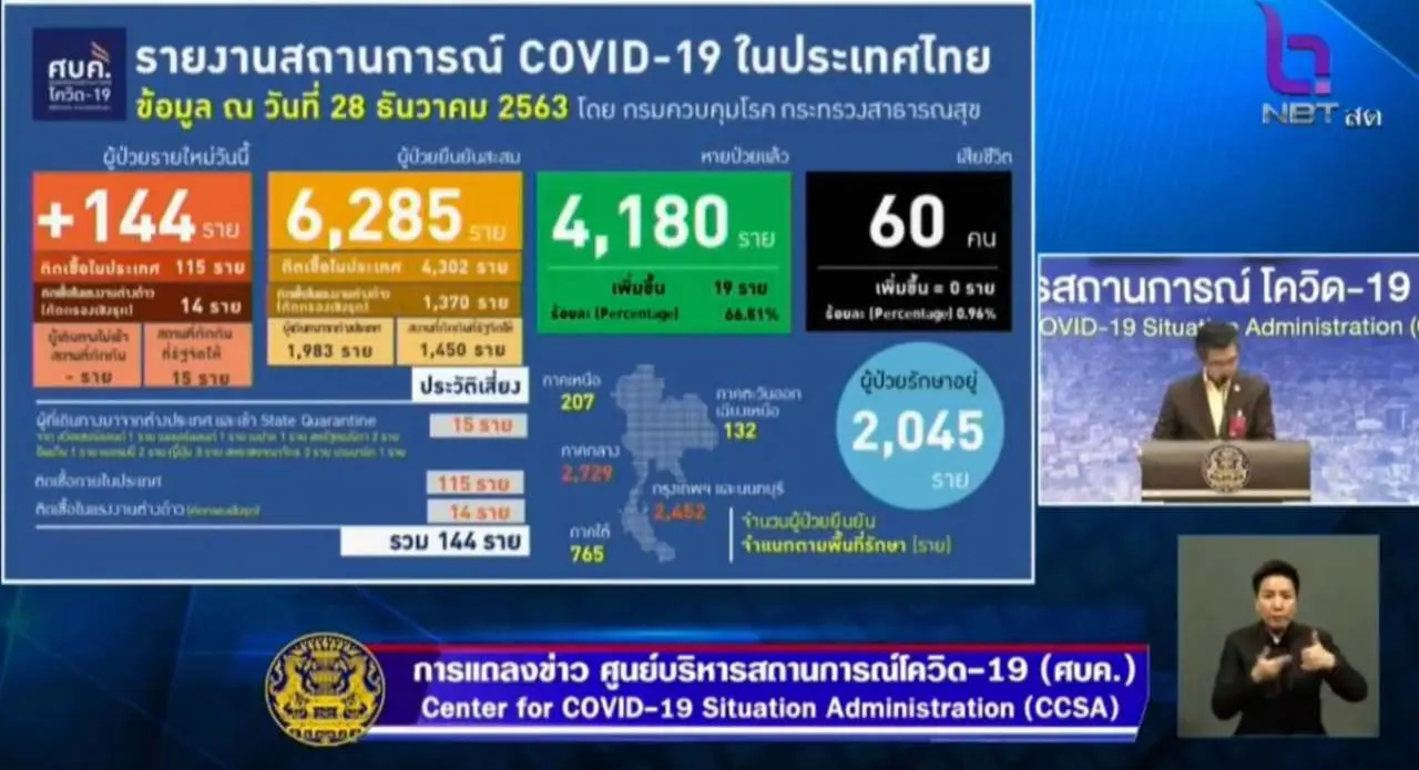 แถลงสถานการณ์โควิด-19 วันที่ 28 ธันวาคม 63 ติดเชื้อเพิ่ม 144 ราย