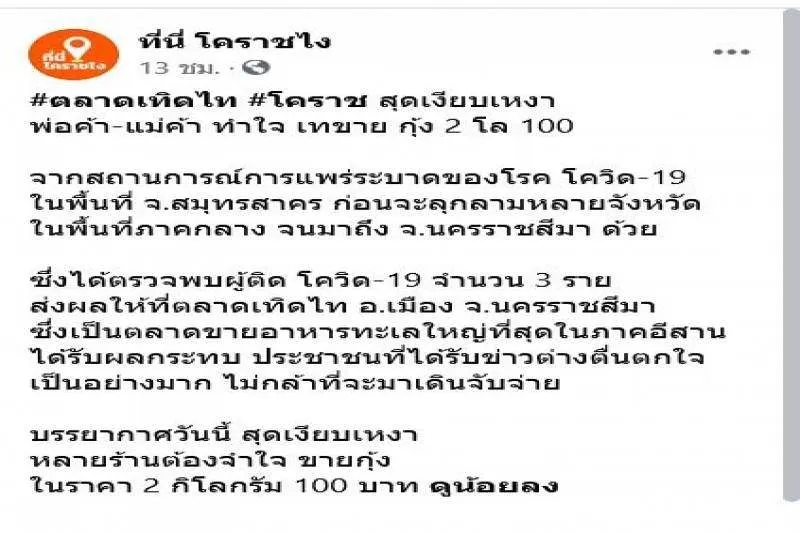วันที่ 26 ธันวาคม 2563 เพจเฟซบุ๊กที่นี่โคราช ได้โพสต์ภาพพร้อมข้อความระบุว่า ตลาดเทิดไท โคราช สุดเงียบเหงา พ่อค้า แม่ค้า ทำใจ เทขาย กุ้ง 2 โล 100 จากสถานการณ์การ cvd ในพื้นที่ จ.สมุทรสาคร ก่อนจะลุกลามหลายจังหวัด ในพื้นที่ภาคกลาง จนมาถึง จ.นครราชสีมา ด้วย ซึ่งได้ตรวจพบ จำนวน 3 ราย ส่งผลให้ที่ตลาดเทิดไท อ.เมือง จ.นครราชสีมา ซึ่งเป็นตลาดขายอาหารทะเลใหญ่ที่สุดในภาคอีสาน ได้รับผลกระทบ ประชาชนที่ได้รับข่าวต่างตื่นตกใจ เป็นอย่างมาก ไม่กล้าที่จะมาเดินจับจ่าย บรรยากาศวันนี้ สุดเงียบเหงา หลายร้านต้องจำใจ ขายกุ้ง ในราคา 2 กิโลกรัม 100 บาท