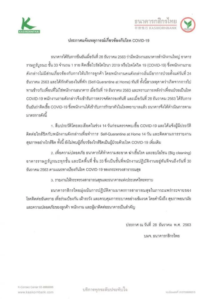 ธนาคารกสิกรไทย เปิดเผยว่า พบพนักงานในสำนักงานใหญ่ที่ราษฏร์บูรณะ ชั้น 33 ติดโรคระบาดโควิด-19 จำนวน 1 ราย โดยพนักงานรายดังกล่าว ไม่มีส่วนเกี่ยวข้องกับการให้บริการกับลูกค้า และยังไม่พบผู้เกี่ยวข้องใกล้ชิดติดโรคระบาดโควิด-19