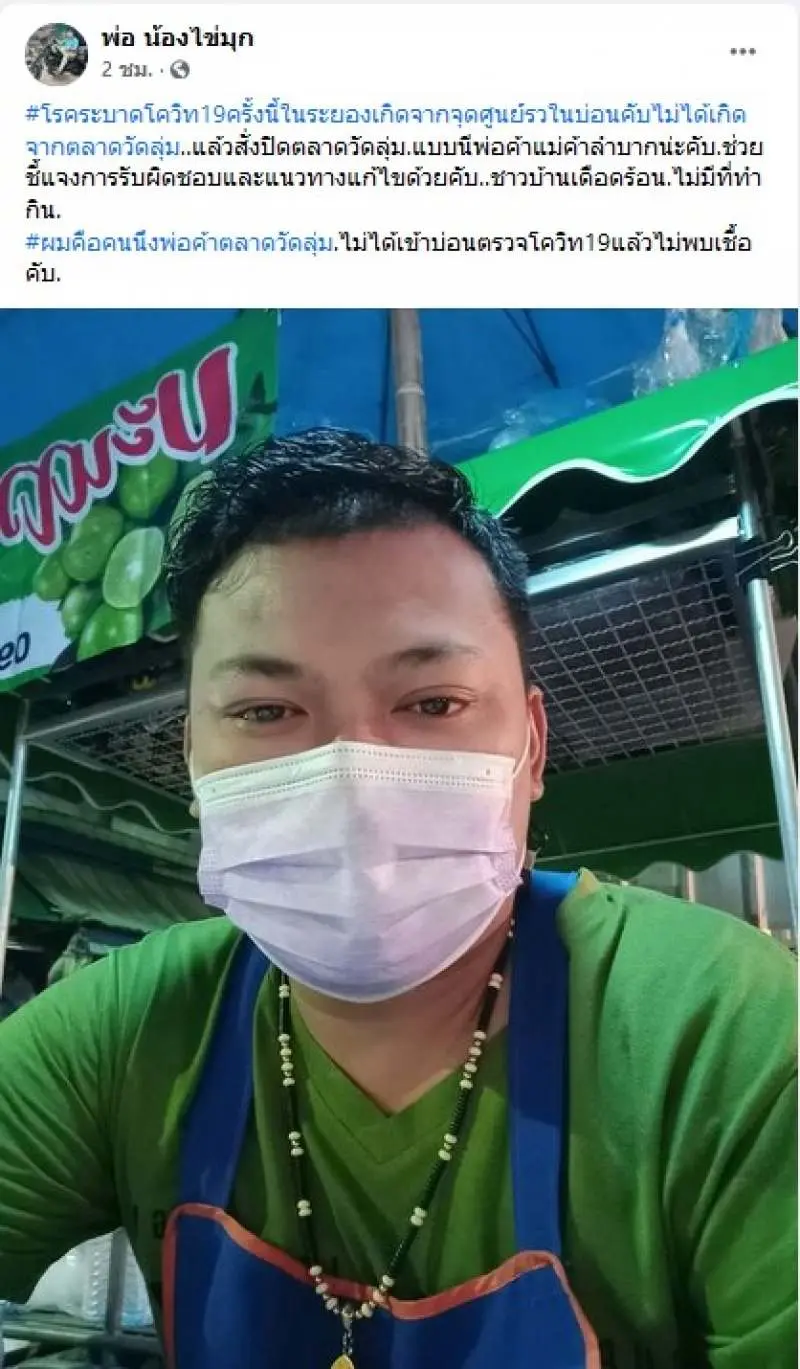“CV-19 ครั้งนี้ในระยองเกิดจากจุดศูนย์รวมในบ่อนครับไม่ได้เกิดจากตลาดวัดลุ่มแล้วสั่งปิดตลาดวัดลุ่มแบบนี้พ่อค้าแม่ค้าลำบากนะครับช่วยชี้แจงการรับผิดชอบและแนวทางแก้ไขด้วยครับชาวบ้านเดือดร้อนไม่มีที่ทำกินผมคือคนนึงพ่อค้าตลาดวัดลุ่ม ไม่ได้เข้าบ่อนตรวจ CV-19 แล้วไม่พบผู้ติดครับจากใจพ่อค้าคนนึง”