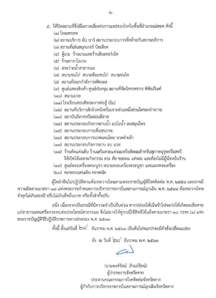 5.ให้ปิด 20 สถานที่เสี่ยงการแพร่เชื้อโควิด-19 เช่น โรงหนัง โรงมหรสพ ผับบาร์ คาราโอเกะ ศูนย์การค้า ศูนย์ประชุม สระวายน้ำ ฟิตเนส สปา อาบอบนวด เป็นต้น