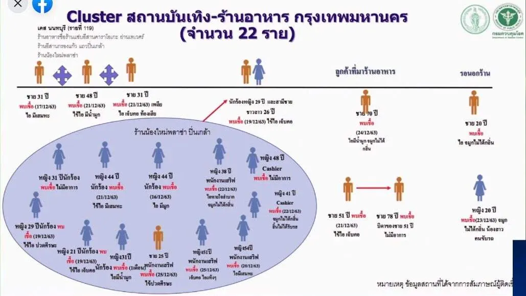 พร้อมขอความร่วมมือผู้ที่ไป ร้านอาหารอีสานกรองแก้ว, ร้านน้องใหม่พลาซ่า ย่านปิ่นเกล้า และ ร้านแซ่บอีสานคาราโอเกะ ย่านเทเวศร์ ตั้งแต่ 15 - 20 ธ.ค. ขอให้สังเกตอาการตนเอง 14 วัน หากพบอาการผิดปกติขอให้เข้าไปตรวจที่โรงพยาบาลโดยทันที