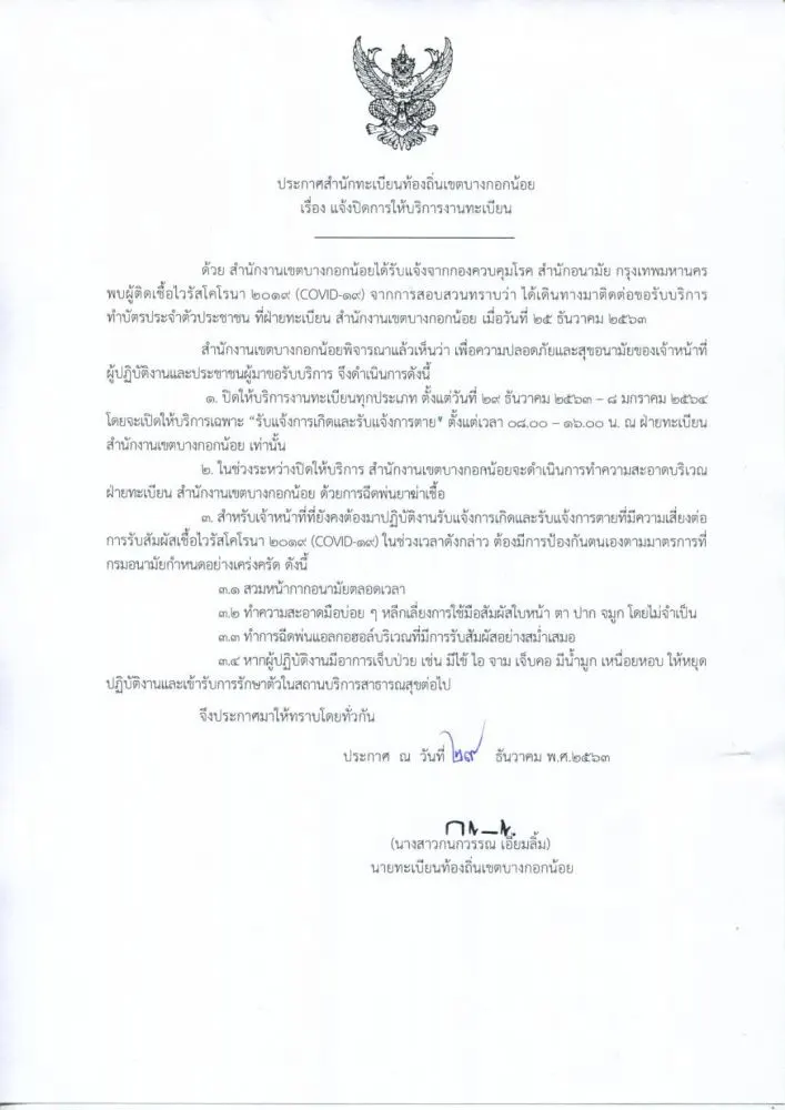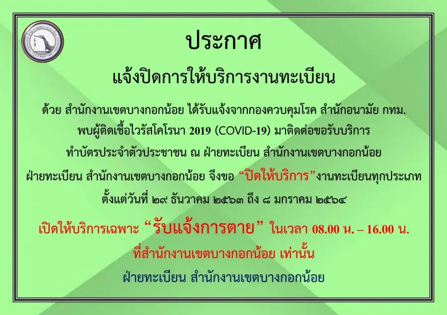 ด้วย เมื่อวันที่ 25 ธันวาคม 2563 เวลาประมาณ 14.30-16.00 น. มีผู้มาใช้บริการงานทะเบียนบัตรประจำตัวประชาชน ต่อมาในวันที่ 28 ธันวาคม 2563ได้รับแจ้งจากสำนักอนามัยว่าผู้ใช้บริการคนดังกล่าวตรวจพบการติดเชื้อไวรัส โคโรนา 2019 (COVID-19) จึงขอให้ผู้ที่มาใช้บริการในช่วงเวลาดังกล่าว กักตัวอยู่บ้านและสังเกตอาการตนเองเป็นเวลา 14 วัน