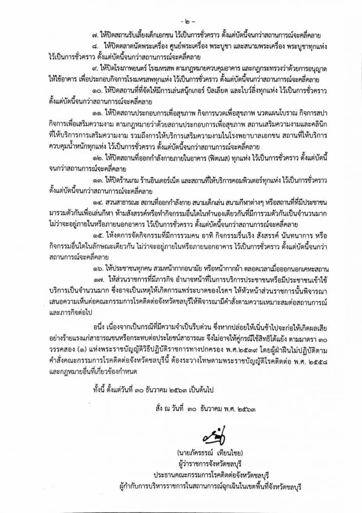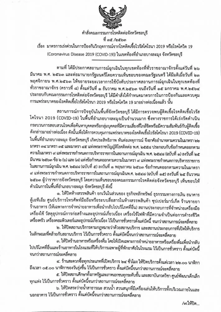ล่าสุด ผวจ.ชลบุรี ออกคำสั่งปิดสถานที่ชั่วคราวในพื้นที่บางละมุง อาทิ ห้าง สถานบริการ สถานศึกษา ร้านนวด สระว่ายน้ำ สถานรับเลี้ยงเด็ก ตลาดนัด โรงหนัง สนุกเกอร์ โบว์ลิ่ง ฟิตเนส ร้านเกม และร้านสะดวกซื้อให้ปิดเวลา 22.00 น.