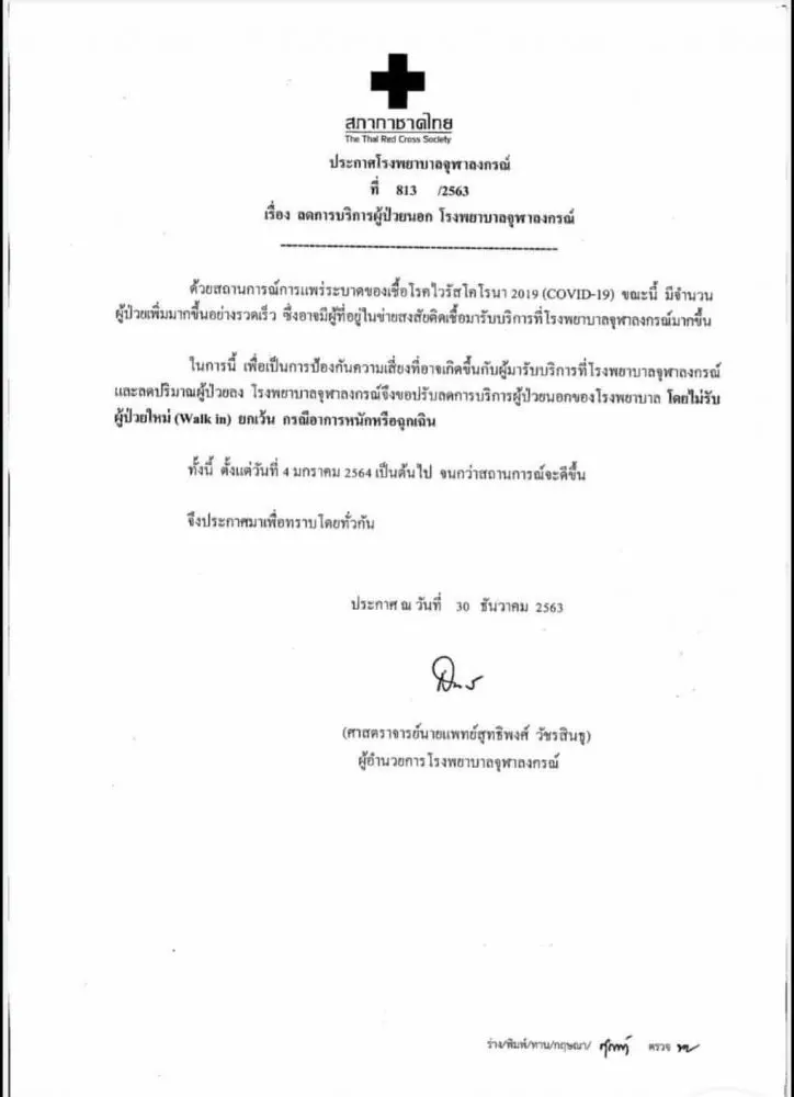 ในการนี้ เพื่อเป็นการป้องกันความเสี่ยงอาจเกิดขึ้นกับผู้มารับบริการที่โรงพยาบาลจุฬาลงกรณ์ และรถปริมาณผู้ป่วยลง โรงพยาบาลจุฬาลงกรณ์ จึงขอปรับลดการบริการผู้ป่วยนอกของโรงพยาบาล โดยไม่ได้รับผู้ป่วย (Walk in) ยกเว้นกรณีหนักหรือฉุกเฉิน