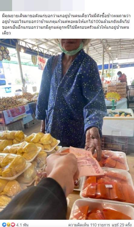มีคุณยายเดินมาขอตังแก่บอกว่าแกอยู่บ้านคนเดียวไม่มีตังซื้อข้าวผมถามว่าอยู่บ้านอะไรแกบอกว่าบ้านเกตุแก้วแต่พอผมให้แกไป100แล้วแกยังเดินไปขอคนอื่นอีกแกบอกว่าแกมีลูกแต่ลูกหนีไปมีครอบครัวแล้วให้แกอยู่บ้านคนเดียว
