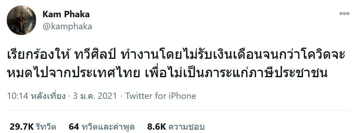 เรียกร้องให้ ทวีศิลป์ ทำงานโดยไม่รับเงินเดือนจนกว่าโควิดจะหมดไปจากประเทศไทย เพื่อไม่เป็นภาระแก่ภาษีประชาชน