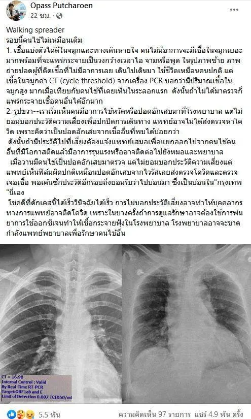 1. เชื้อแบ่งตัวได้ดีในจมูกและทางเดินหายใจ คนไม่มีอาการจะมีเชื้อในจมูกเยอะมากพร้อมที่จะแพร่กระจายเป็นวงกว้างเวลาไอ จามหรือพูด ในรูปภาพซ้าย ภาพถ่ายปอดผู้ที่ติดเชื้อที่ไม่มีอาการเลย เดินไปเดินมา ใช้ชีวิตเหมือนคนปกติ แต่เชื้อในจมูกค่า CT (cycle threshold) จากเครื่อง PCR บอกว่ามีปริมาณเชื้อในจมูกสูง มากเมื่อเทียบกับคนไข้ที่เคยเห็นในระลอกแรก ดังนั้นถ้าไม่ได้มาตรวจก็แพร่กระจายเชื้อคนอื่นได้อีกมาก