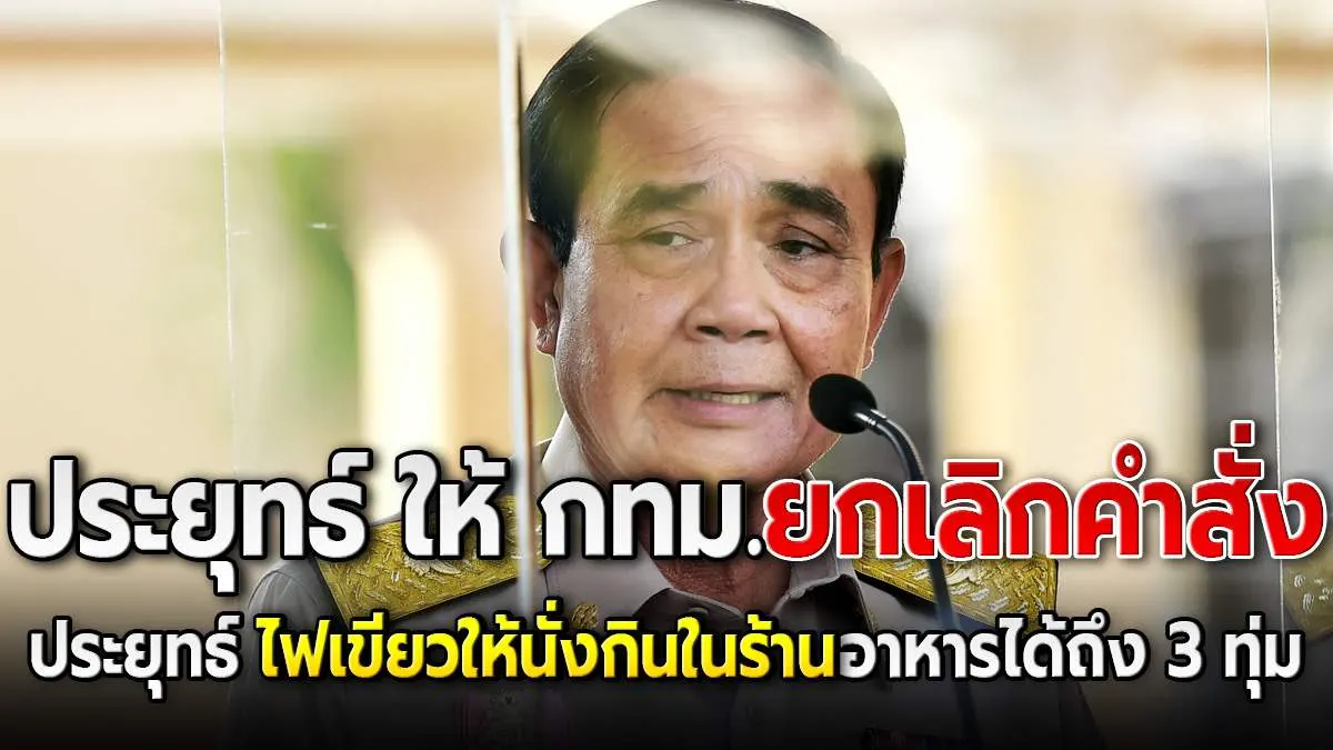 ด่วน!! เวลา 16.30 น. พลเอก ประยุทธ์ จันทร์โอชา นายกรัฐมนตรี ให้ยกเลิกคำสั่งกรุงเทพมหานครที่จะให้ร้านอาหารห้ามให้นั่งรับประทานอาหารจากเวลา 19.00 น.-06.00 น.เป็นเวลา 21.00 น.- 06.00 น .ยืนยันยังไม่มีการประกาศล็อคดาวน์จังหวัดใด แต่ให้ แต่ละพื้นที่เป็นผู้กำหนดตามสถานการณ์เอง