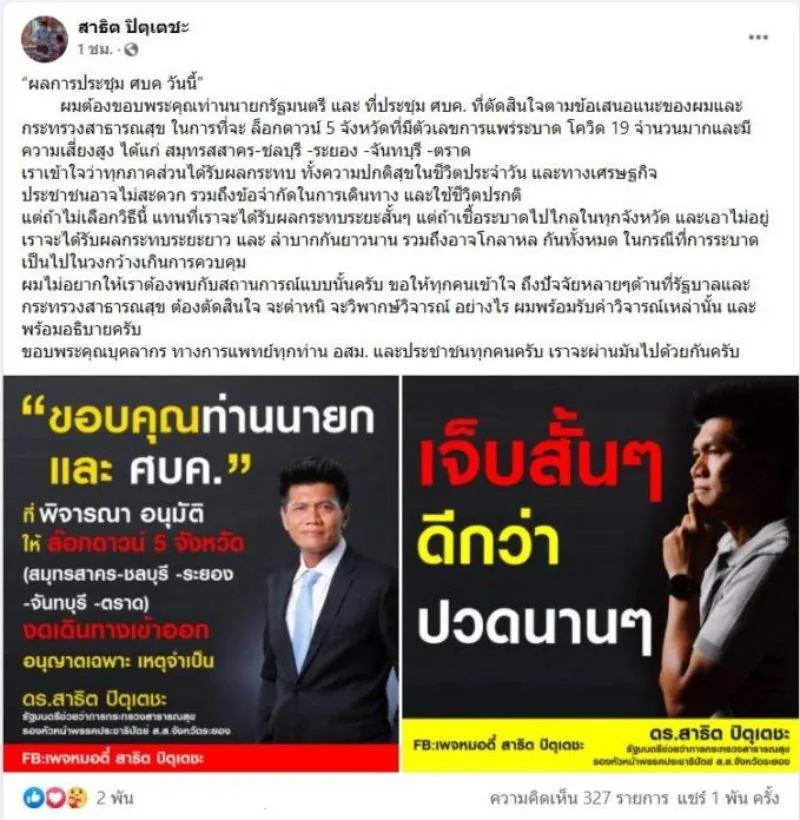 ล็อกดาวน์ 5 จังหวัด ตามที่ตนและกระทรวงสาธารณสุขเสนอ ประกอบด้วย สมุทรสาคร-ชลบุรี -ระยอง -จันทบุรี -ตราด