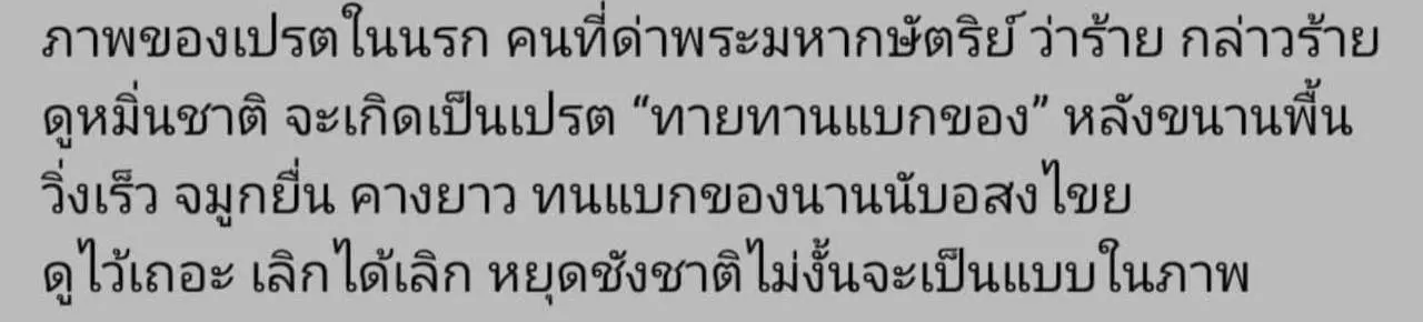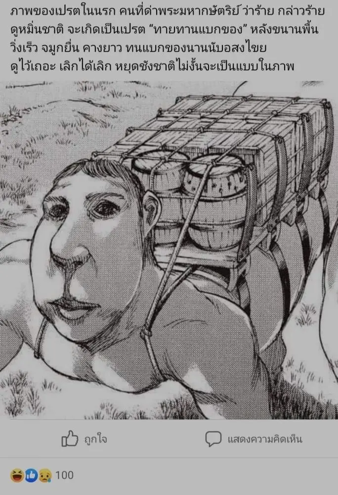 ภาพของเปรตในนรก คนที่ด่าพระมหากษัตริย์ ว่าร้าย กล่าวร้าย ดูหมิ่นชาติ จะเกิดเป็นเปรต "ทายทานแบกของ" หลังขนานพื้น วิ่งเร็ว จมูกยื่น คางยาว ทนแบกของนานนับอสงไขย ดูไว้เถอะ เลิกได้เลิก หยุดชังชาติไม่งั้นจะเป็นแบบในภาพ
