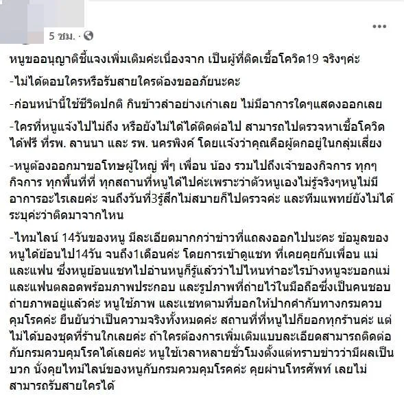 -หนูต้องออกมาขอโทษผู้ใหญ่ พี่ๆ เพื่อน น้อง รวมไปถึงเจ้าของกิจการ ทุกๆกิจการ ทุกพื้นที่ที่ ทุกสถานที่หนูได้ไปค่ะเพราะว่าตัวหนูเองไม่รู้จริงๆหนูไม่มีอาการอะไรเลยค่ะ จนถึงวันที่3รู้สึกไม่สบายก็ไปตรวจค่ะ และทีมแพทย์ยังไม่ได้ระบุค่ะว่าติดมาจากไหน