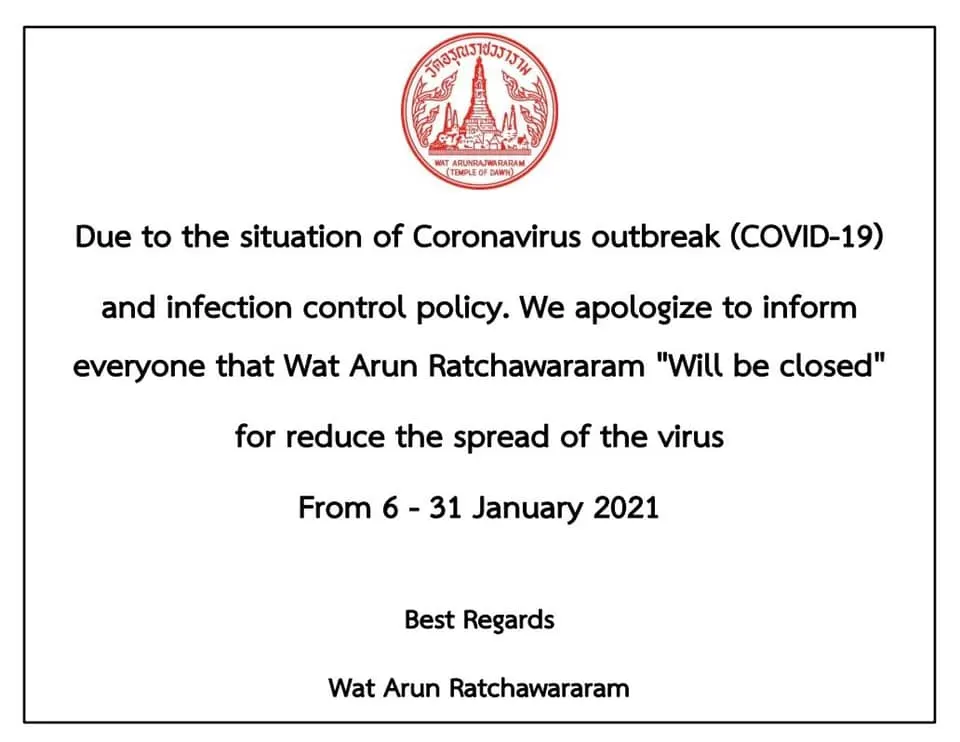 สั่งปิด!! วัดอรุณราชวราราม 6-31 ม.ค.64
