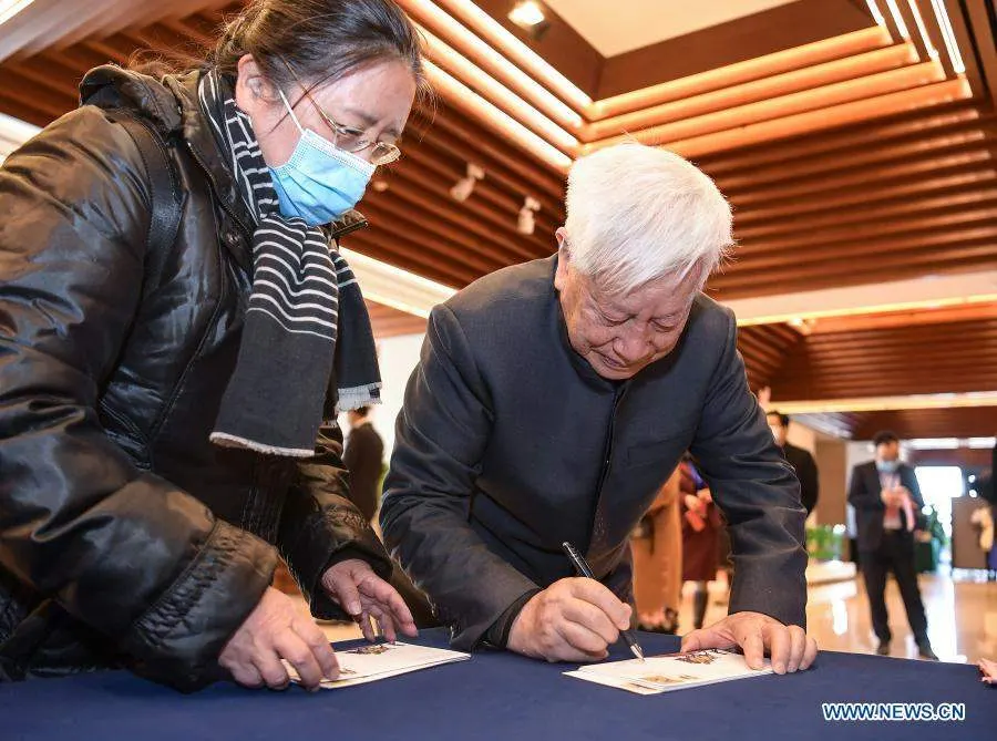 ศิลปิน Yao Zhonghua และ Liu Aili ประธานบริษัท China Post Group Co.,Ltd. เข้าร่วมพิธีออกชุดแสตมป์พิเศษในธีมปีฉลู ซึ่งออกแบบโดย Yao ในกรุงปักกิ่ง เมืองหลวงของจีน